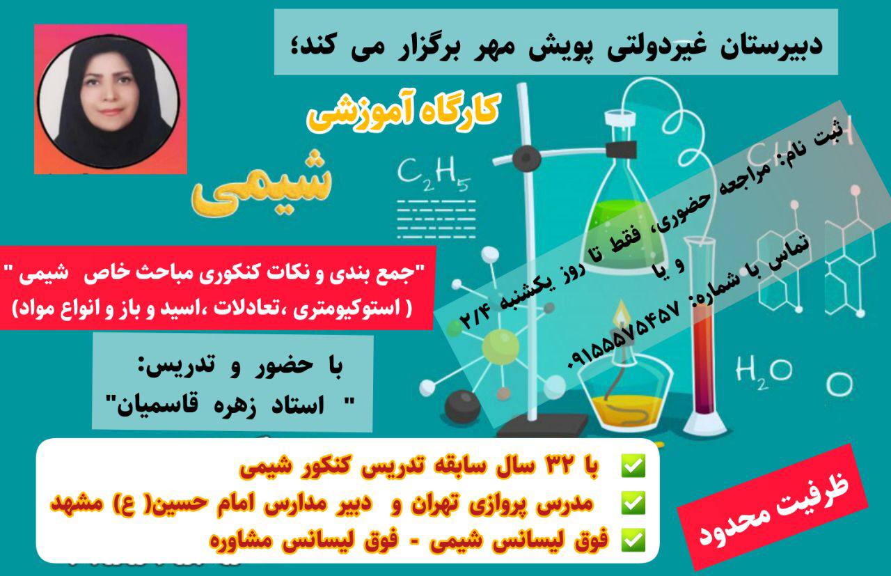 برگزاري كارگاه شيمي دوازدهم تجربي : جمعه ، ٩ ارديبهشت از ساعت ٨:٣٠ تا  ١٣